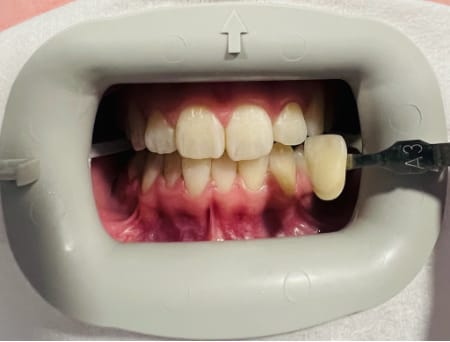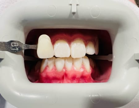 We start the Zoom whitening process by covering your lips and gums leaving only your teeth exposed. At this time, we can usually estimate how white your new smile will be by matching your teeth with a whitening shade and estimate approximately up to 8 shades whiter from here.